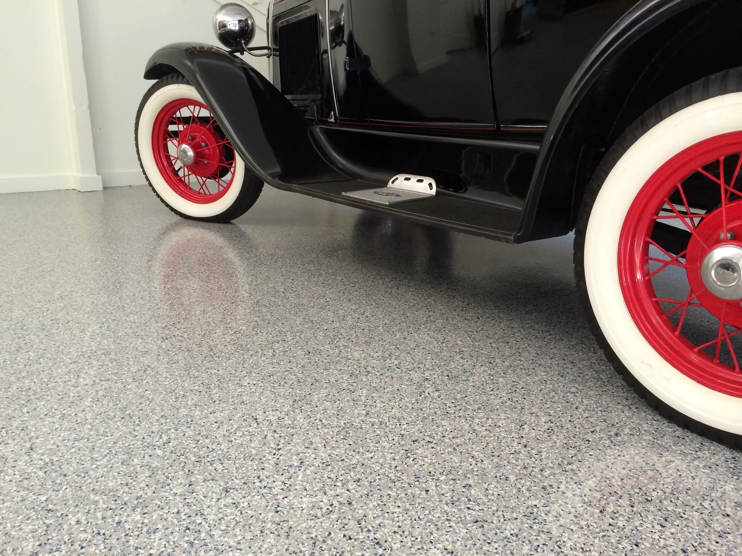 Vinyl Flake systems are popular in service drives, break rooms, residential garages, shops, man-caves etc. These floors provide a textured, decorative finish that is achieved using a blend of colored vinyl flakes. The vinyl flakes (or paint chips, as some people refer to them) come in a variety of sizes as well, which enable the customer to create a very aesthetically pleasing blend of colors that can match almost any color scheme. These floors are often specified as an alternative to vinyl tile (VCT) or ceramic tile. Vinyl Flake systems are multi-coat broadcast systems, consisting of a penetrating primer, one or more broadcast coats of 100% solids epoxy and vinyl flakes, and one or more top coats of high solids clear polyaspartic., or Urethane with UV blocker.