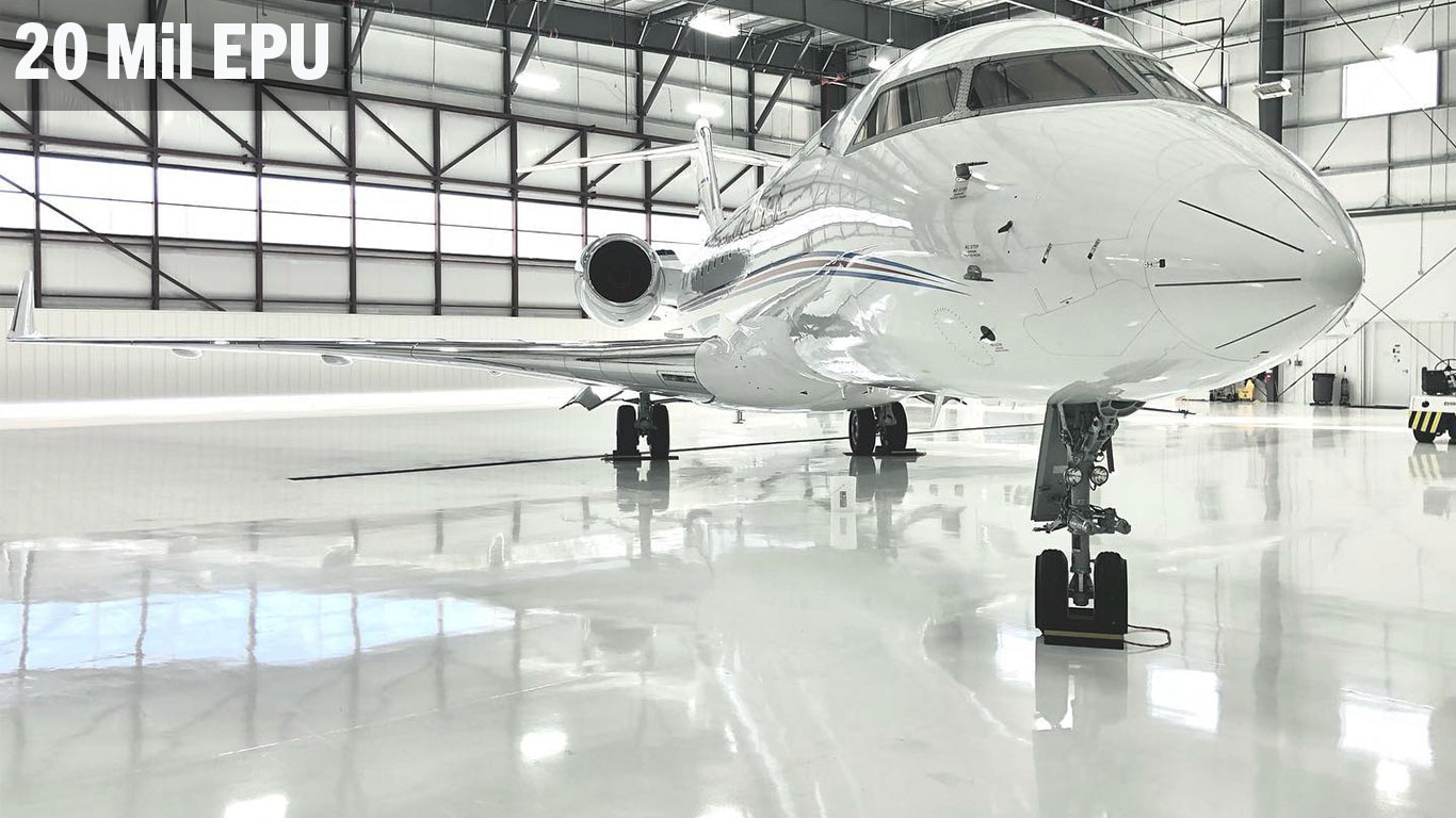 The 20 Mil EPU System is an affordable thin-film system that consists of one primer coat of 100% solids epoxy, followed by a build coat of epoxy and a final top coat of aliphatic urethane. The urethane provides added gloss retention, UV stabilization, and chemical resistance. This thin-film system is applied over mechanically scarified surfaces (using shot-blast machines, or planetary grinders ) and in some cases can be applied over properly cleaned and sanded existing coatings. These are pigmented systems, and can have a smooth gloss finish, or non-skid textures can be achieved using aluminum oxide aggregates of various sizes.
